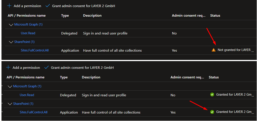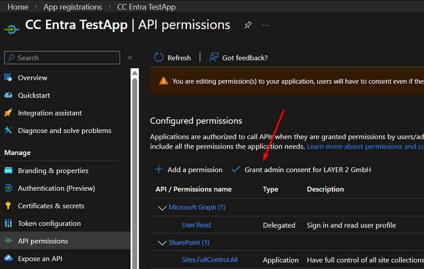 After that, grant admin consent for the newly added permission. The permission must show as granted before the app can be used successfully.